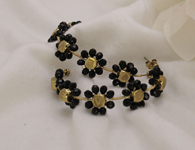 Orecchini Fiore a cerchio dorati con perline nere, chiusura a farfallina