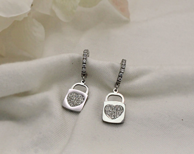 Orecchini Lucchetto d'amore color argento, con strass e ciondolo a forma di lucchetto con cuore con strass, chiusura a farfallina